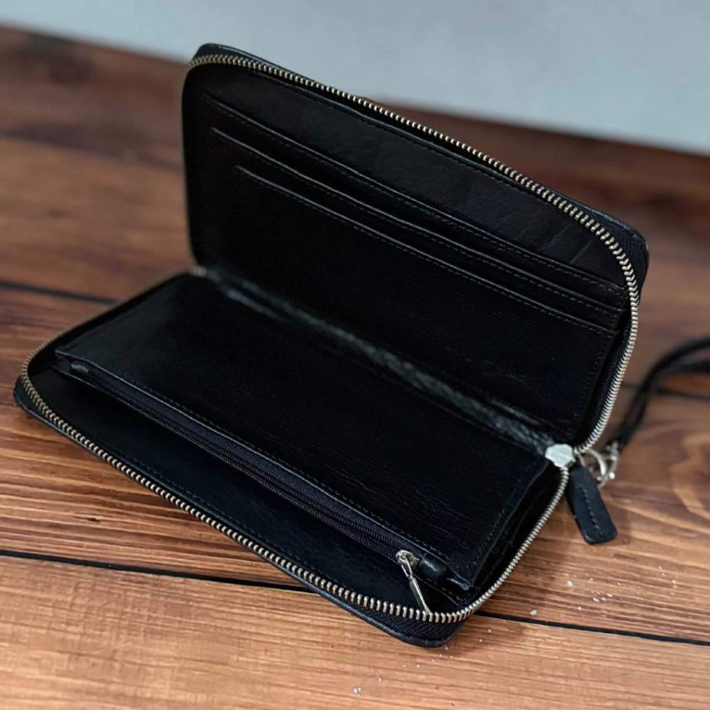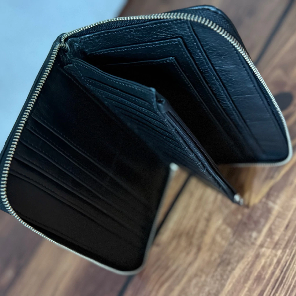 Cuenta con capacidad para 16 tarjetas, 5 bolsillos grandes (uno de ellos con cierre) y doble espacio para billetes, lo que la convierte también en una excelente opción como porta pasaporte. Su formato práctico y elegante permite llevar todo lo importante de forma segura y bien organizada.
